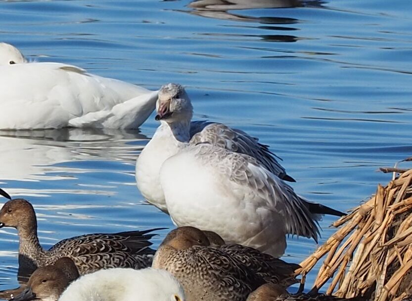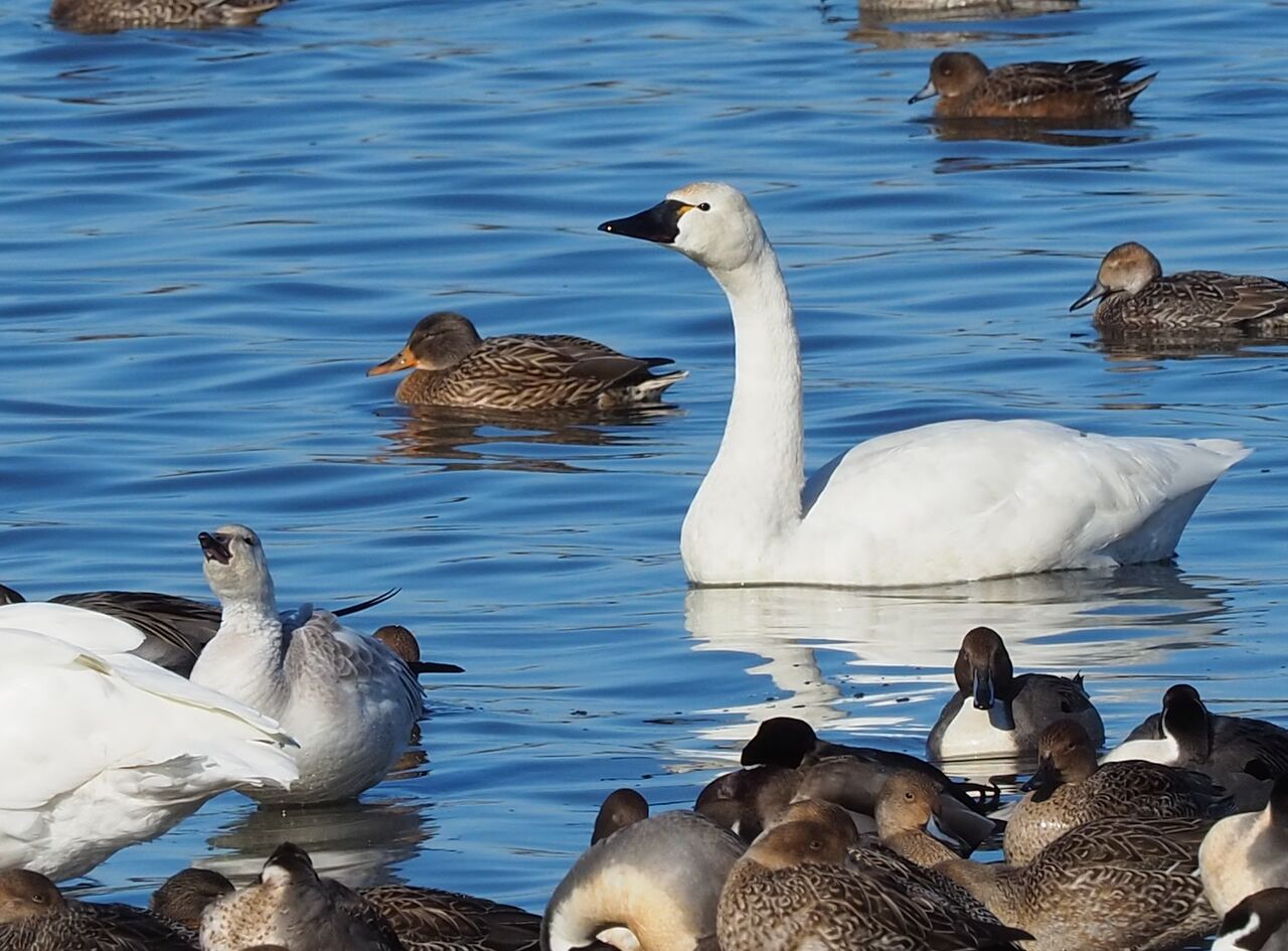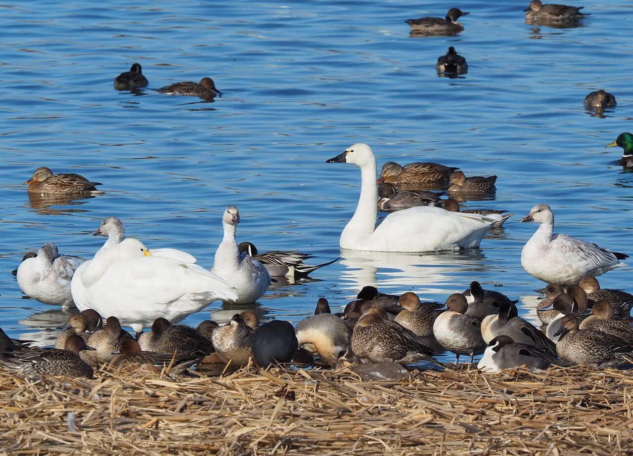 大沼の水鳥 アメリカコハクチョウ、ハクガン、ミコアイサ